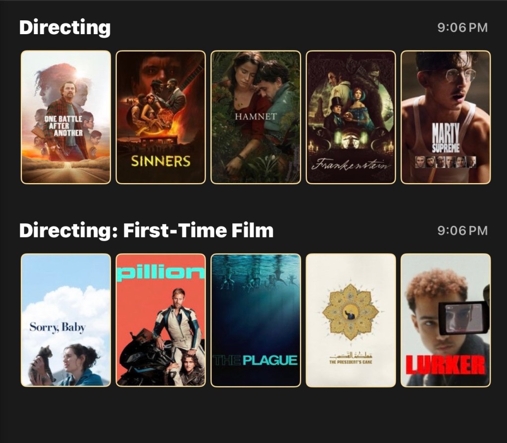 Also shoutout to First Time Film – Directing category! I’m going in for “Sorry, Baby” and hope Eva Victor can thank Julia Roberts for the best for your consideration shoutout from the Golden Stage. The only upset I see happening is for Harry Lighton for “Pillion” that just hit limited release in the domestic market. However, we’ll see how the nominees strike out tomorrow!